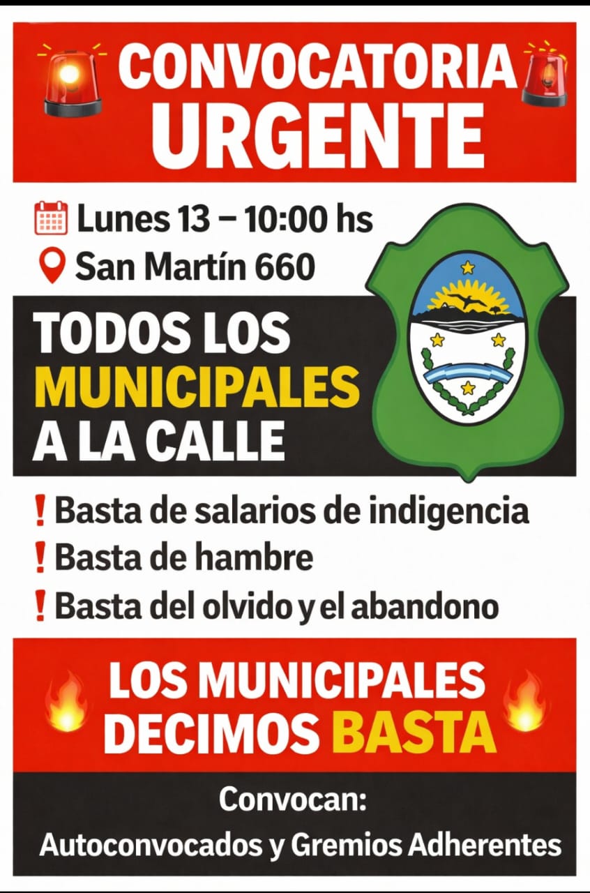 La convocatoria fue fijada para el lunes 13 a las 10:00 horas, con concentración en San Martín 660, bajo la consigna “Todos los municipales a la calle”.
