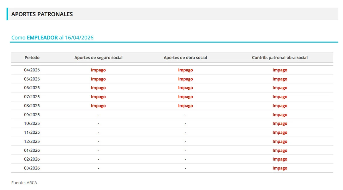 Uno de los puntos más críticos del informe es la situación previsional de la firma. Velitec registra aportes patronales impagos de forma consecutiva durante el último año. Al 16 de abril de 2026, la empresa presenta deudas por aportes de seguridad social y obra social correspondientes a todos los períodos desde abril de 2025 hasta marzo de 2026.