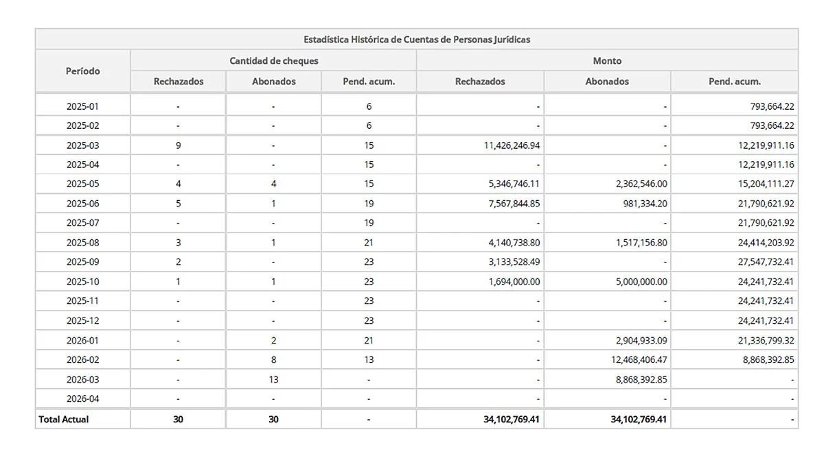 La totalidad de los rechazos fue por emitir documentos financieros sin fondos. El pico de morosidad fue durante el mes de marzo de 2025, con 9 cheques rechazados por más de 11 millones de pesos.